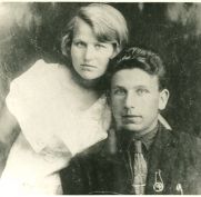 Стоят: справа - Зайцев (двадцатипятитысячник) и его жена учительница».